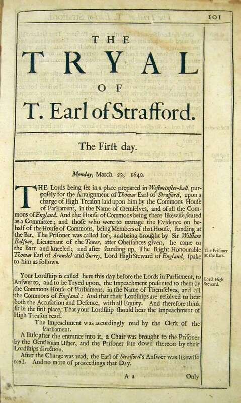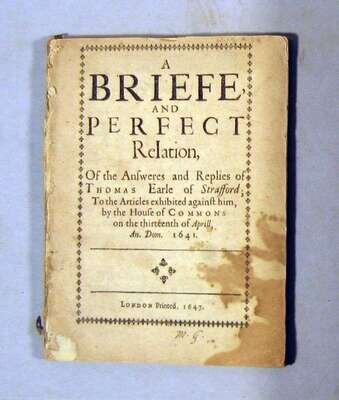 (English Law.) Rushworth, John. The Tryal of Thomas Earl of Strafford, Lord Lieutenant of Ireland, Upon an Impeachment of High Treason by The Commons Assembled in Parliament. London, 1700. The Second Edition. Folio, old bds.; worn & defective, front cover gone, back cover detached. Moderate staining to title page. Blister to bottom gutter corner of first leaf of dedication, small loss of text. Minor dampstaining to leaf Aa. Signature B re-hinged. Signatures Aa-Na, pp. 101-204 bound out of order, before title page. * A Briefe and Perfect Relation of The Answeres and Replies of Thomas Earle of Strafford to The Articles exhibited against him, by The House of Commons on the Thirteenth of April,... 1641. London, 1647. Sm. 4to, disbound. Some darkening & staining to title page, some internal staining - primarily confined to margins. Wing R-68.