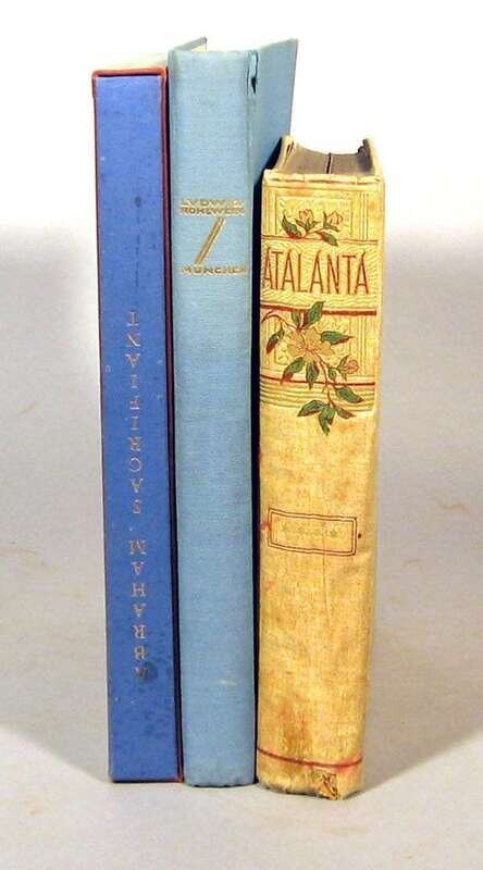 Graphic Art - Including Periodical Literature: Atalanta. October 1890 to September 1891. London: Trischler, (1890-1891). Edited by L.T. Meade. 4to, orig. gilt & color pictorial floral beige cloth; moderate wear. Illus., incl. frontis. after E. Burne-Jones. Adverts., some internal spotting. Ownership signature.* Frenzel, H.K., compiler & editor. Ludwig Hohlwein. Berlin: Phoenix, 1926. 4to, orig. blue cloth, gilt; light wear, plates, incl. color plates. Chipping to bottoms of several leaves.* (Girschia, L., orig. lithos. by.) Beze, Theodore de. Abraham Sacrifiant. (Paris): Editions de Seuil, (1943). # 247/250 (of 268). 4to, orig. wrappers, sleeve, slipcase. Full-page litho illus. Loose as issued. Slight foxing to wrappers.