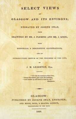 Leighton, J.M. Select Views of Glasgow and Its Environs. Glasgow: Joseph Swan, 1829. 8vo, contemp. 1/2 calf & marbled bds., spine gilt; scuffed, joints stressed. With frontis. + 31 steel-engraved plates. Some, mostly minor, offsetting & foxing. Internally generally clean.