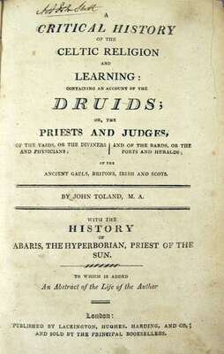 Toland, John. A Critical History of The Celtic Religion and Learning: Containing an Account of The Druids. London: Lackington, Hughes, Harding, n.d. [ca. 1810]. 8vo, old cloth-backed bds.; worn, hinges tender. Early owner's signature at head of title page. Light to moderate foxing. Untrimmed.