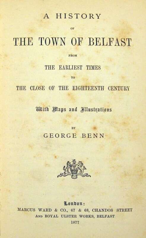 Benn, George. A History of The Town of Belfast... to The Close of The Eighteenth Century. London: Marcus Ward, 1877. Thick 8vo, orig. brown cloth, spine gilt; scuffed, head of spine deeply frayed, other edge wear, joints stressed. With 12 plates & maps, incl. fold. maps. Scattered light to moderate foxing.
