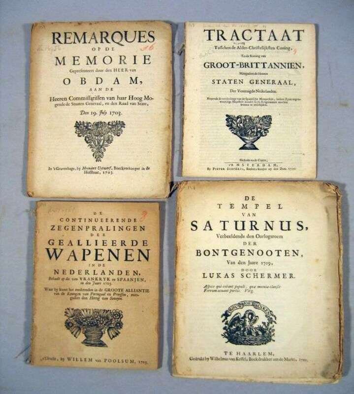 Early 18th-Century Political Pamphlets - Continental imprints, primarily Dutch, mostly relating to the War of The Spanish Succession: T'Samen-Spraak Tusschen... Het Testament van Karel de II Konigh van Spanjen. Cologne: P. Hamer, 1700. Sm. 4to, old wrappers. (1)-40 pp. * Manifeste... raisons... Hauts et Puissant Seigneurs... declares le guerre a la France & a' L'Espagne... 15 May, 1702. The Hague: P. Scheltus, 1702. Sm. 4to, old wrappers. (1)-8 pp. * Onderzoek van't Staats-Belang van Engeland en Holland. Rotterdam: B. Bos, 1701. Sm. 4to, disbound. (ii), (1)-52 pp. * Tractaat... Groot-Brittannien,... Staten Generaal, der Vereenigde Nederlanden. Amsterdam: P. Sceperus, 1700. Sm. 4to, disbound. (1)-16 pp. * Afschetsinge... Koninglyke familie,... van Het Hof van Vrankryk. Ville Franche: P. Pinceau, 1702. Sm. 4to, old wrappers. (1)-31 pp. Slightly toned. * Antwoord... memorie... Koning van Vrankrijk. Leeuwarden: K. Tjallings, 1702. Sm. 4to, disbound. (1)-(8) pp. Minor dampstaining. * De Continueerende Zegenpralingen der Geallieerde Wapenen in de Nederlanden. Utrecht: W. van Poolsum, 1703. Sm. 4to, disbound. (1)-56 pp. Title page slightly toned. * Kort Mondelijck Rapport... Generael J.B.V. Wassenaer. The Hague: M. Uytwerf, 1703. Sm. 4to, disbound. (1)-7 pp. Moderately toned, slightly trimmed. * Remarques... Heer van Oldam,... Den 19 July 1703. The Hague: M. Uytwerf, 1703. Sm. 4to, disbound. (1)-15 pp. Minor foxing. * Triumph van Auxiliaire Geallieerde Wapenen. Utrecht: W. van Poolsum, 1703. Sm. 4to, disbound. (1)-24 pp. Slightly toned, minor staining. * De Tempel van Saturnus,... Haarlem, 1710. 4to, self-wrappers, untrimmed (disbound?). (1)-24 pp. Scattered light foxing. * Tractaat van Vreede en Vriendschap... En haar Majestesteyt... Groot Bretagne...Utrecht,... 1713. Utrecht: W. V. Water; J. V. Poolsum, 1713. Sm. 4to, self-wrappers, untrimmed (disbound?). (1)-15 pp. Ink stains at top edges. * Tractaet... Vreede,... 11 April 1713... Majesteyt van Vranckryck,... The Hague, 1713. Sm. 4to, old wrappers, partly unopened. (1)-47 pp. Minor occasional dampstaining. * Aanmerkingen op de Kroons-Erffenis van den Hartog van Anjou. London, n.d. Sm. 4to, disbound. (1)-40 pp. Some foxing to front matter. * Koning Lodewyk in de Grieksea tot Delft, op Het Eyndigen de Campangje 1702. Bon, n.d. Sm. 4to, old wrappers. Untrimmed. (1)-8 pp. * Lyste... Troupen... Koning van Vrankryk. The Hague: N. Wilt, n.d. Sm. 4to, orig. self-wrappers. (1)-10 pp. Old ink corrections. * Brief aan Mylord... restitutie van de Spaanse Monarchie. N.p., n.d. Sm. 4to, disbound. (1)-27 pp. * The French-language ed. of the preceding, n.p., n.d. Sm. 4to, disbound. (1)-24 pp. Trimmed, some loss of text at foot of last leaf. * Relacion del Combate y Feliz Victoria de las Armas de las dos Coronas... de 1703 - caption title. Sm. 4to, old wrappers. Old ink numerical markings. All with minor scattered wear only if not otherwise indicated. More than 20 pamphlets.