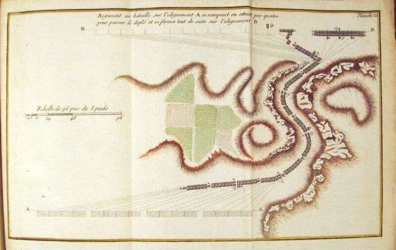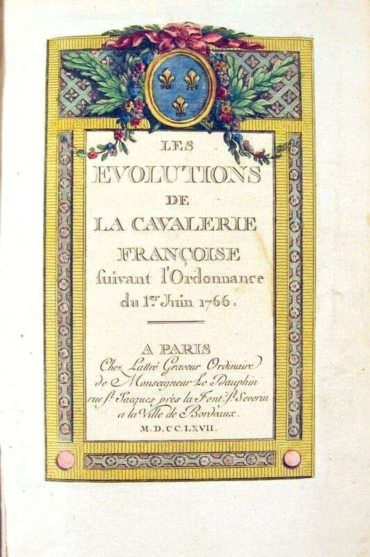 (Cavalry.) Les Evolutions de la Cavalerie Francoise suivant l'Ordonnance du 1 er. Juin 1766. Paris: Chez Lattre Graveur Ordinaire de Monseigner le Dauphin rue St. Jacques, 1767. First edition. 8vo, contemp. mottled calf, gilt floral spine, red morocco spine label, marbled endpapers; occasionally scuffed, joints cracked but holding. With 25 (of 29?) plates, 8 fully-colored, the rest with outline color; also with 4 (of 8?) pp. engraved text. Sold with all faults.