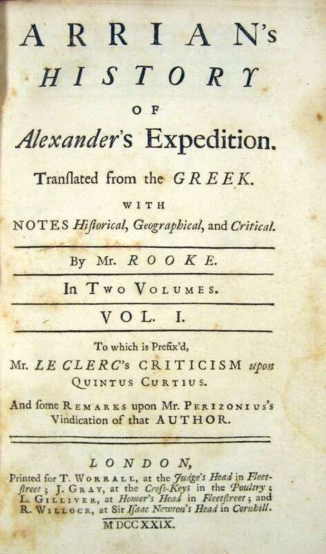 (Arrianus, Flavius.) Arrian's History of Alexander's Expedition. Translated from The Greek [and edited] by Mr. Rooke. London, 1729. 8vo, contemp. paneled calf, red morocco spine labels. Fold. map. Scattered light to moderate foxing.
