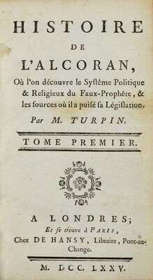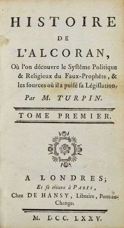 Turpin, Francois Rene. Histoire de l'Alcoran, ou l'on decouvre le Systeme Politique & Religieux du Faux-Prophete, & les sources ou il a puise sa Legislation. London; Paris: Chez de Hansy, 1775. First edition. 12mo, contemp. speckled polished brown calf, gilt-floral paneled spine, raised bands, morocco spine labels, marbled endpapers, edges stained red. Internally generally clean. Lacking 1/2 titles.