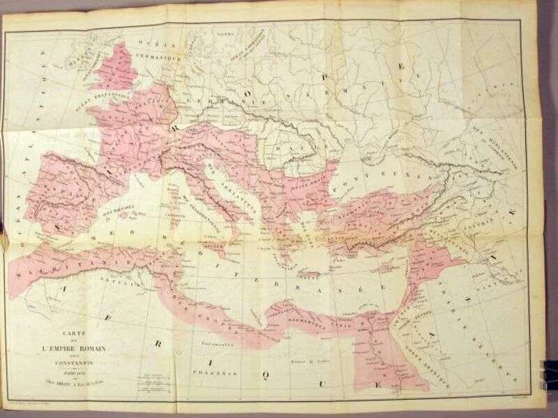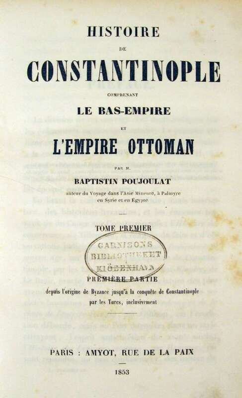 Poujoulat, Baptisim. Histoire de Constantinople Comprenant le Bas-Empire et l'Empire. Paris: Amyot, 1853. First edition. 8vo, contemp. bds., brown calf spines & corners, spines gilt; occasionally scuffed, joints occasionally rubbed, corners bumped. With 2 partly hand-colored fold. maps. Light foxing to front & back matter, occasional light foxing to maps, a few small close tears to maps. Complete with 1/2 titles. Ex-library - ink stamps on title, ink stamp & ms. markings on front paste-downs.