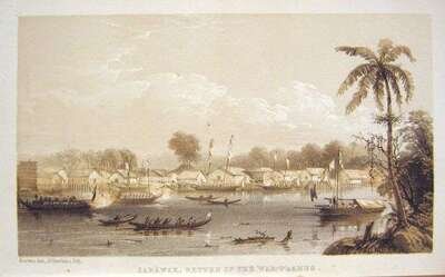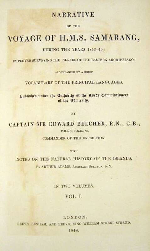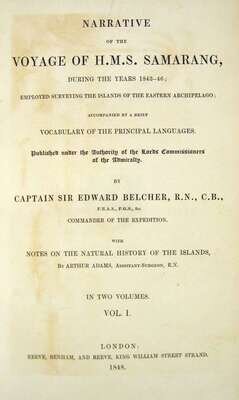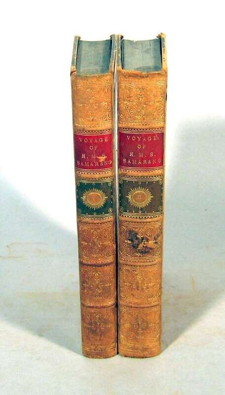 Belcher, Sir Edward. Narrative of The Voyage of H.M.S. Samarang, During The Years 1843-1846... Islands of The Eastern Archipelago. London: Reeve, Benham and Reeve, 1848. First edition. 8vo, contemp. tan calf, gilt, spines gilt, red & green morocco spine labels, marbled edges; some scuffing & fading to covers, extremities occasionally rubbed. With 3 fold. maps; occasional close tears along folds, 2 single leaf maps, 10 tinted & color litho plates, 20 b/w plates. All together complete with 35 maps & plates. Minor offsetting to vol. 1 title page, minor foxing to front matter. Internally generally clean & crisp.