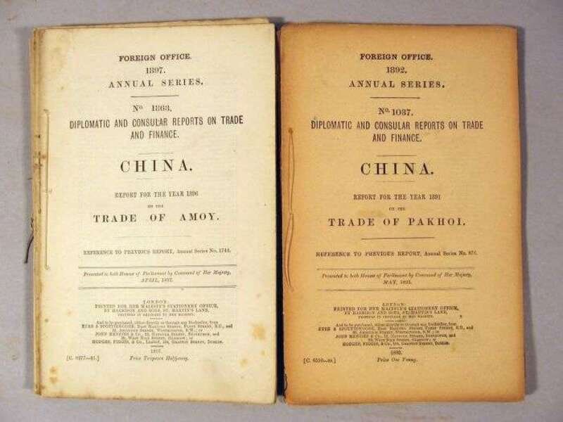 (China Trade.) Foreign Office Annual Series, Diplomatic and Consular. Reports on Trade and Finance, China. London, 1892-1897: Wenchow (1891); Amoy (1891); Kiungchow (1891); Kiukiang, (1891); Pakhoi (1891); Wenchow (1891); Swatow (1892); Newchwang (1895); Wuhu (1895); Kiukiang (1895); Foreign Trade of China (1895); Chinkiang (1895); Amoy (1896); Ningpo (1896); Canton (1896). All 8vo, orig. sewn self-wrappers; scattered wear, a few wrappers detached.