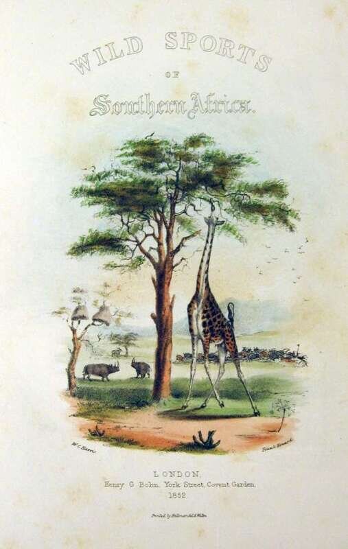 Harris, William Cornwallis. Wild Sport of Southern Africa. London : H.G. Bohn, 1852. Fifth Edition. 8vo, orig gilt. pictorial red cloth, a.e.g; spine gone, covers detached, bdg. broken. With additional hand-colored vignette title, 25 hand color plates, fold. map. Internally generally clean.