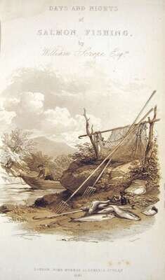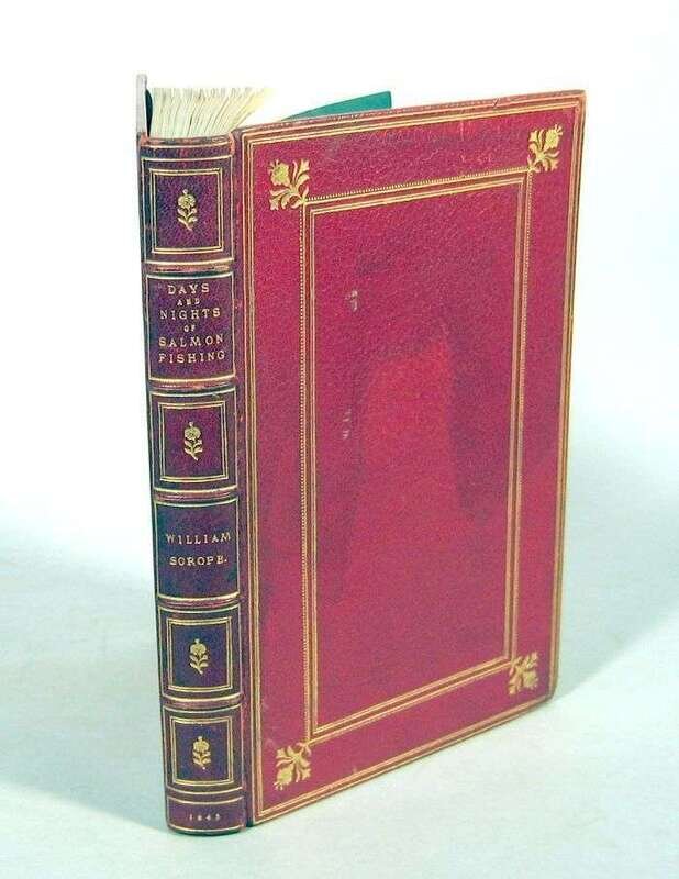 Scrope, William. Days and Nights of Salmon Fishing in The Tweed. London: John Murray, 1843. First edition. Tall 8vo, contemp. full gilt-paneled red morocco, gilt & floral corner decorations, gilt & floral paneled spine, inner dentelles gilt, t.e.g.; slightly scuffed, extremities slightly rubbed, occasional minor discoloration. With 13 lithographic plates (3 hand-colored), wood-engraved text illus. Some marginal dampstaining. Hand-colored plates clean. Complete with 1/2 title.