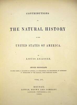 Agassiz, Louis. Contributions to The Natural History of The United States of America. Boston: Little, Brown, 1857-1862. First edition. Folio, orig. brown cloth; spines gone or defective, other wear & chipping. With 76 plates. Some dampstaining in vol. 3.