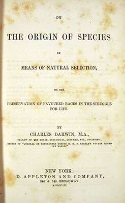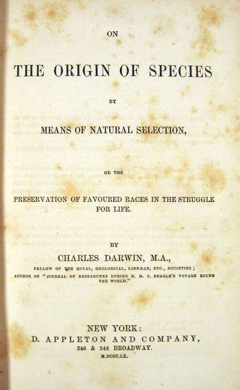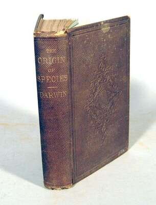 Darwin, Charles. The Origins of Species by Means of Natural Selection. New York: D. Appleton, 1860. First American edition, second issue. 8vo, orig. blind-stamped brown cloth, gilt-lettered spine; corners bumped, spine ends frayed & chipped. With fold. table. Light to occasionally moderate foxing, moderate foxing to title page, table moderately toned. Sound copy.