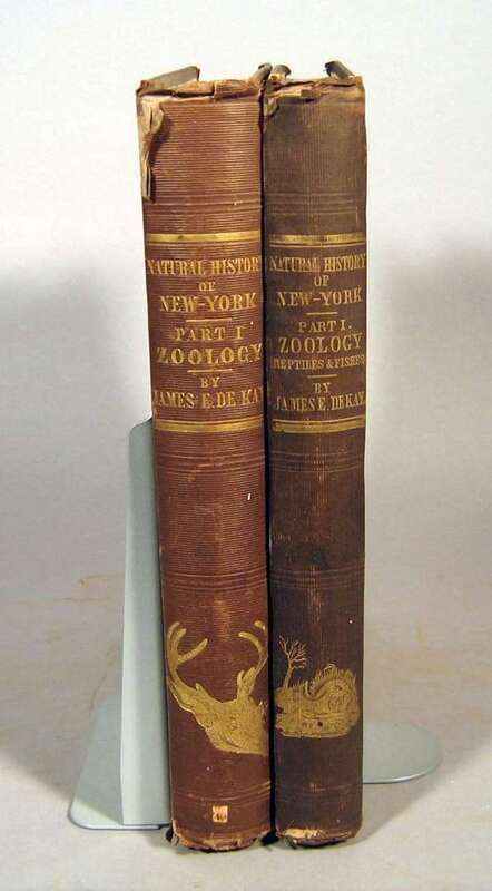 De Kay, James E. Zoology of New York, or the New-York Fauna. Albany, 1842. Mammalia; Plates of the Reptiles and Amphibians. 4to, orig gilt-pictorial & blind-stamped brown cloth; edge wear, spine ends frayed. With 2 plans & 33 plain plates on Mammals; 79 plain plates on Reptiles and Amphibians. Scattered light foxing.
