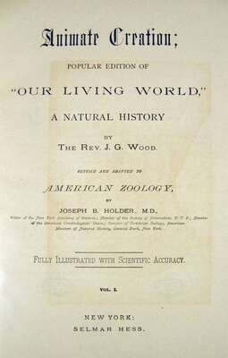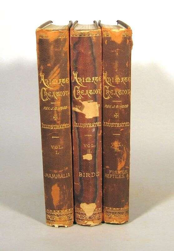 Wood, J.G. Animate Creation. New York: Selman, Hess, (1885). Sm. folio, orig. morocco-backed gilt-pictorial cloth; spines rubbed & blistered. With 30 chromolithographic plates, numerous wood-engraved illus. Internally clean.