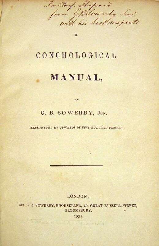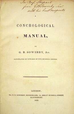 Sowerby, G(eorge) B. A Conchological Manual. London: G.B. Sowerby, 1839. First edition. 8vo, orig. green cloth, blind-stamped covers, gilt-stamped spine; casing loose, spine chipped. With 24 hand-colored plates. 96 pp adverts. at end. Contents loose, but generally clean. Presentation copy, inscribed to Prof. Shepard & signed by Sowerby on the title-page.