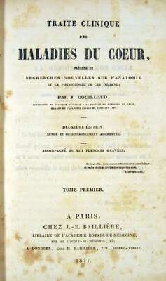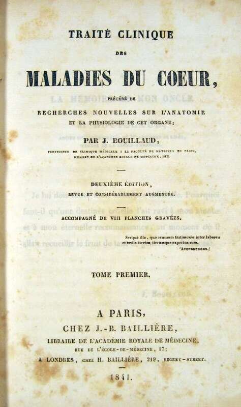 Bouillard, J(ean) (B). Traite Clinique des Maladies du Coeur. Paris: J.B. Bailliere., 1841. Second edition. 8vo, contemp. calf & bds.; spine gone, edge wear. With 8 fold. plates. Scattered light foxing.