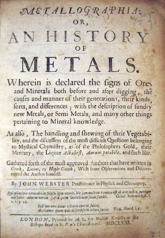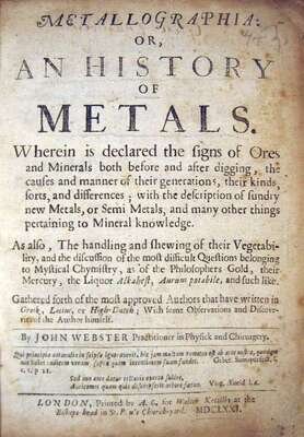 Webster, John. Metallographia: or, An History of Metals. London: A.C. for Walter Kettilby, 1671. First edition. 4to, late 19th-Century 3/4 brown calf & marbled bds., gilt-lettered spine; slightly scuffed. Some spotting to title & front matter. Trimmed - no loss of ptg.