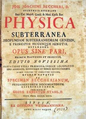 Becher, Johann Joachim. Physica Subterranea. Leipzig: Weidmann, 1738. 4to, contemp. speckled calf, edges stained red; rather scuffed, front cover detached. Frontis. Moderate foxing to many quires.