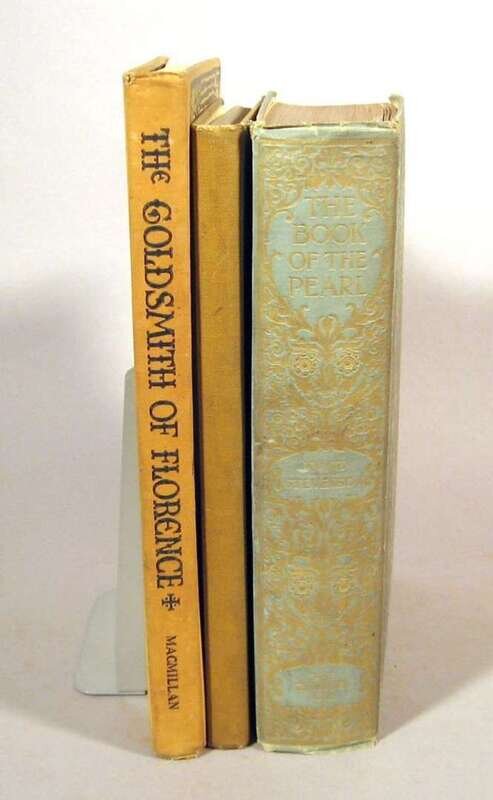 Pearls, Precious Metal, Portrait Miniatures: Kunz, George Frederick; Stevenson, Charles Hugh. The Book of The Pearl. New York: Century, 1908. 1st ed. Lg. 8vo, orig. richly decorated blue cloth, t.e.g., other edges untrimmed; moderately scuffed & dust soiled. Color frontis., color plates with lettered tissue guards, b/w plates. Internally generally clean. *Williamson, George C. Portrait Miniatures. London, etc: The Studio, 1910. 4to, orig. green cloth, paper cover label; some edge wear, light to moderate dust soiling. Color & plain plates. * Gibson, Katharine The Goldsmith of Florence: A Book of Great Craftsmen. New York: Macmillan, 1929. 1st ed. 4to, orig. pictorial blue stamped yellow cloth; light edge wear, slightly dusty. Photo plates, other illus.