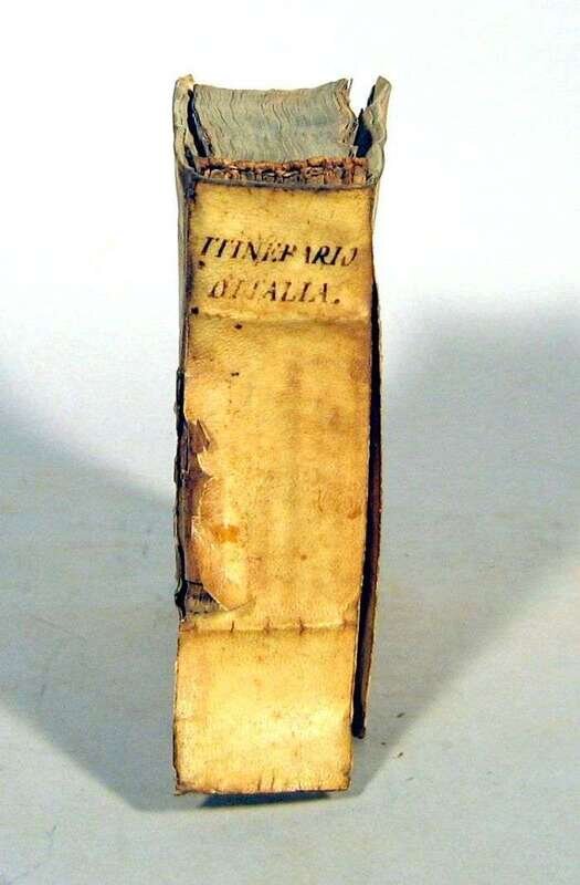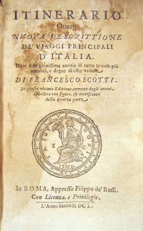 Scotti, Francesco. Itinerario Overo Nuova Decrittione de'viaggi Principali de Italia. Rome: F. de Rossi, 1650. 8vo, contemp. limp vellum; dampstained. With 20 fold. plates, map & town views. Rather heavy internal dampstaining.