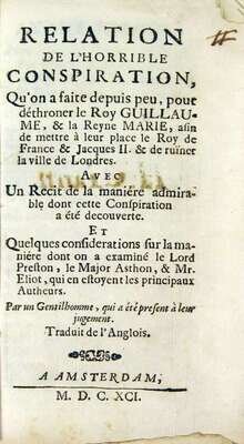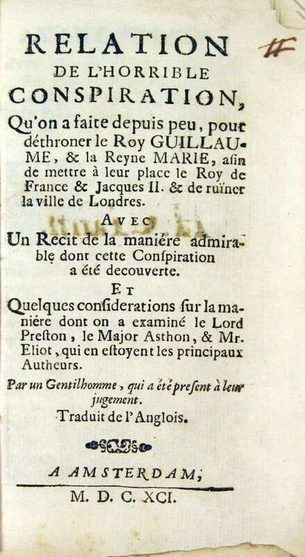 Relation de l'Horrible Conspiration,... pour dethroner le Roy Guillaume, & la Rayne Marie,... Amsterdam, 1691. First French-language edition. 12mo, orig. marbled wrappers. Former owner's stamp on verso of title page, small ink symbol on title. Untrimmed, generally clean & crisp. (1)-46 pp.