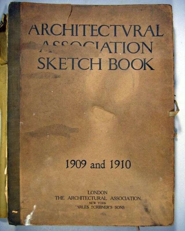 Architectural Association Sketch Book. London, (1909-1910). Folio, orig. bds. (vols. 1 & 2), contemp. cloth (vol. 3); bdgs. worn & soiled. With 411 plates (vol. 1: 131; vol. 2 132; vol. 3: 151). Scattered wear & dust soiling to plates. Many orig. part wrappers preserved. Sold with all faults.