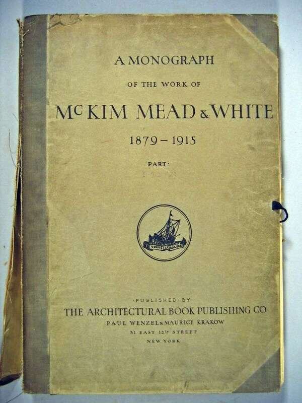McKim, Mead & White. A Monograph of the Work of... 1879-1915. New York, [1915-1918]. Folio, orig. bds (parts 1-3), later cloth (part 4); bdgs worn & defective, many parts wrappers preserved. With 365 (of 402) plates, lacking plates 78 & 92 in part 1; plates 108, 125, 127-129, 170, 179, 191, 197 & 198 in part 2; plates 203, 210, 212, 218, 225, 243, 250, 256, 258, 261, 272, 273, 286 & 287 in part 3; plates 312, 328, 332, 337, 341, 342, 359, 371, 385 & 391 in part 4. Plates occasionally dusty. Sold with all faults.