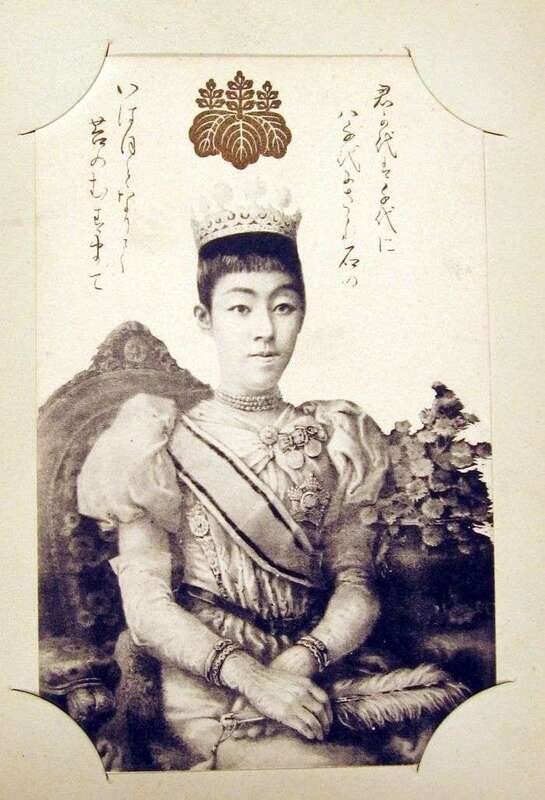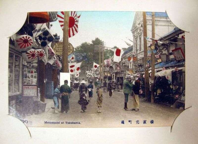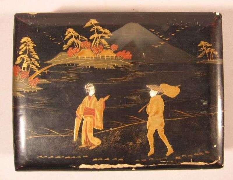 Japanese Postcard Album. Ca. 1910. Gilt & color pictorial laquered bds.; occasionally scuffed, front cover detached. Approx. 5 x 8 1/2 inches (127 x 216 mm). Holding approx. 50 postcards, primarily hand-colored real photo views. Internally clean.