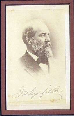 Photograph Signed. Garfield, James A. Mounted albumen print, 5 1/2 x 3 1/2 inches (140 x 89 mm); glue stain along bottom edge. Signature clear. Framed with wood-engravings depicting Garfield's assassination & aftermath.