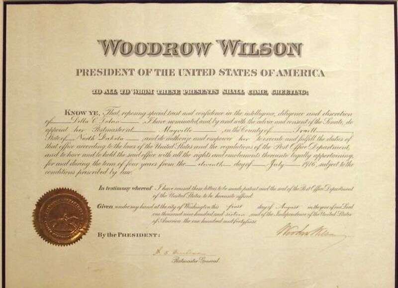 Document Signed. Wilson, Woodrow. Washington, August 1, 1916. 1 p., folio; some creasing. Appointing Della E. Tolan Postmaster, Mayville, North Dakota. With gold-paper seal, counter-signed by The Postmaster General. Uncommon female appointment.
