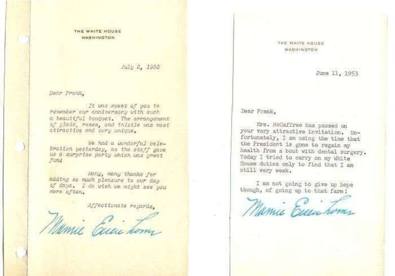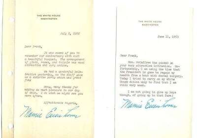 Typed Letters Signed. Eisenhower, Mamie Doud. Washington, D.C.: The White House, various dates (Nov. 16, 1953 - Jan. 3, 1957). Each 1 p., 12mo, or 8vo. All to Frank Ludwick of Ednor, Maryland. Each on White House stationery. 9 signed as Mamie Doud Eisenhower, 8 signed as Mamie Eisenhower. All generally clean with dark signatures. 3 addressed White House envelopes included + 1957 Inaugural Ball invitation. All letters signed as First Lady.