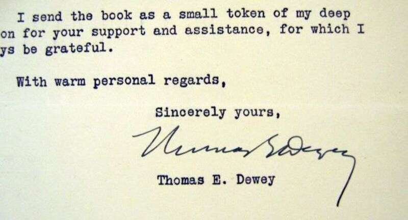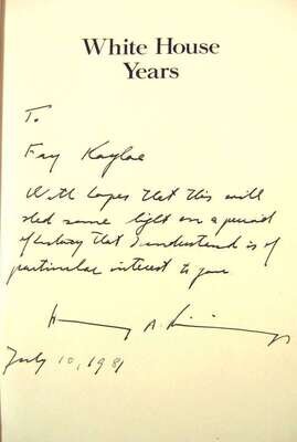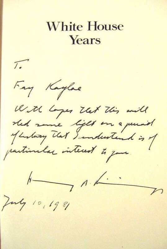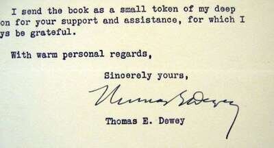 Signed Books & C - American Political & Related Subjects: Acheson, Dean. Morning and Noon. Boston, (1965). 2nd ptg. 8vo, orig. cloth, d/j (some edge wear). Inscribed & signed by Acheson on front free endpaper recto. * Buck, Pearl S. The Kennedy Women. New York, (1970). 4th ptg. 8vo, orig. imitation leather-backed cloth, d/j Signed on 1/2 title by Buck. Minor wear. * Dewey, Thomas E. The Case Against The New Deal. New York, 1940. 1st ed. 8vo, orig. cloth, d/j. Frontis. Some discoloration to frontis. & title page. With 3 Thomas E. Dewey Typed Letters Signed inserted. * Hoover, J. Edgar. A Study of Communism. New York, etc., 1962. 4th ptg. 8vo, orig. cloth, d/j (some edge wear). Presentation copy, inscribed, dated, "1, 21, 66," & signed by J. Edgar Hoover on front free endpaper recto. * "An Honorable Profession." A Tribute to Robert F. Kennedy. Garden City, 1963. 1st ed. #171/1000 signed by Edward M. Kennedy. 8vo, orig. polished black calf; occasionally scuffed, slipcase. * Kissinger, Henry. The White House Years. Boston, (1979). 1st ed. 8vo, orig. cloth, d/j (price clipped). With 4 line autograph inscription, dated, "July 10, 1981," & signed on 1/2 title by Kissinger. * McCarthy, Eugene. Others Things and The Aardvark. Garden City, 1970. 1st ed., #110/250 signed by McCarthy. Tall 8vo, orig. cloth; light wear, slipcase (light edge wear).