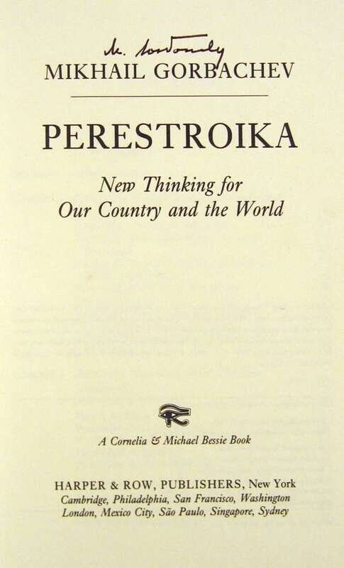Gorbachev, Mikhail. Perestroika. New York, etc.: Harper & Row, (1987). 1st ptg. 8vo, orig. cloth, d/j (light edge wear). Signed by Gorbachev at head of title page.