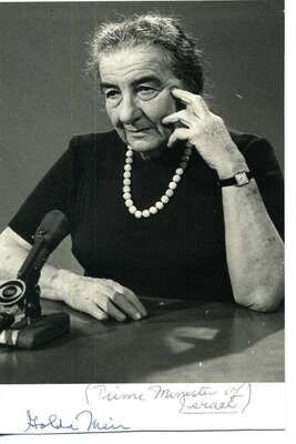 Photograph Signed. Meir, Golda. Silver print, 6 1/4 x 4 1/8 inches (158 x 105 mm), on card stock. Clean & clear signature in blue ink.