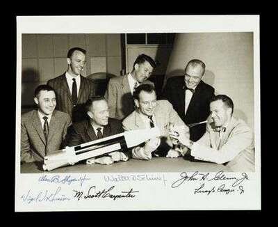 (Project Mercury). Photograph Signed. Group Photograph. [N.d.] Silver print, 8 x 10 inches (203 x 254 mm). Depicting & signed by Alan B. Shepard, Jr.; Walter M. Schirra; John A. Glenn, Jr.; Virgil I. Grissom; M Scott Carpenter; L. [Gordon] Cooper, Jr. Signatures clean & bold. Photo depicting the 7 original Mercury astronauts examining a model of a rocket. Not signed by Daniel K Slayton.
