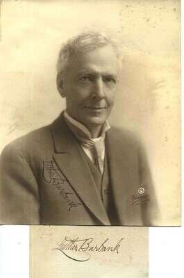 Autograph Material. Burbank, Luther: Photograph Signed. Silver print, 9 1/2 x 7 5/8 inches (240 x 195 mm). Some spotting. By Harstook Photo, ca. 1910. Signature dark & clear. * Card Signed. Some spotting. Signature clear.
