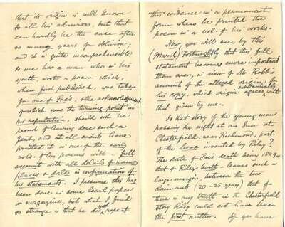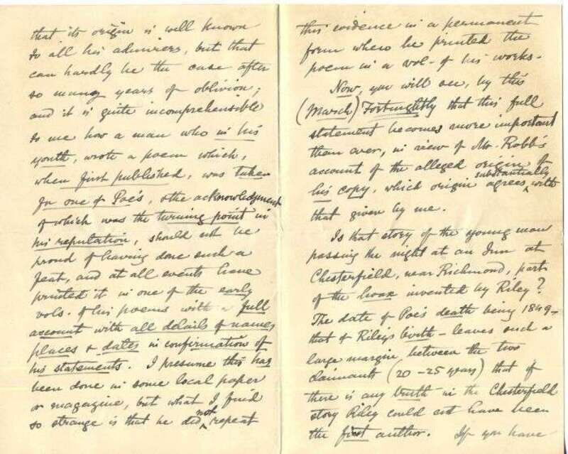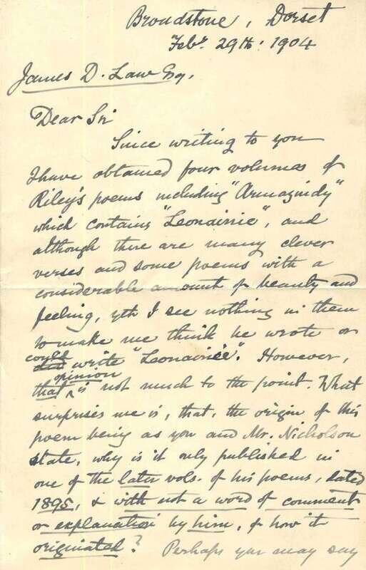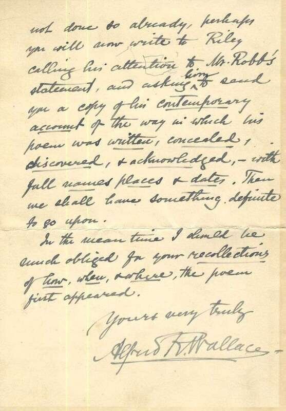 Autograph Letter Signed. Wallace, Alfred. Dorset, Feb. 29, 1904. 4 pp., 12mo; slightly toned. To James D. Law, disputing James Whitcomb Riley's authorship of the poem "Leonainie."