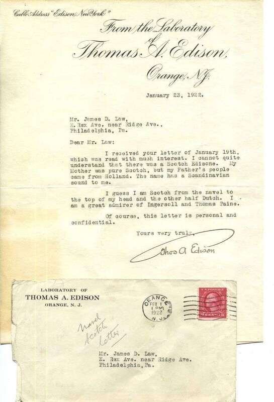 Typed Letter Signed. Edison, Tho[ma]s A. Orange, N.J., Jan. 23, 1922. 1 p., 4to; minor discoloration outside of body of letter, minor creasing along folds. To James D. Law, responding to Law's theory of Edison's Scotch paternal ancestry,... "My Mother was pure Scotch, but my Father's people came from Holland... I guess I am Scotch from the navel to the top of my head and the other half Dutch. I am a great admirer of Ingersoll and Thomas Paine." Attractive, with dark signature, on Edison Laboratory letterhead, also with addressed envelope.