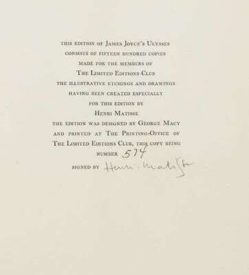 (Limited Editions Club of New York.) Joyce, James. Ulysses. 1935. Illustrated by Henri Matisse. #574/1500 signed by Matisse. 4to, orig. brown cloth, gilt, slipcase. Color & plain plates. Near Fine copy in slightly dusty slipcase.