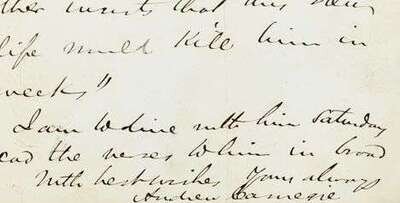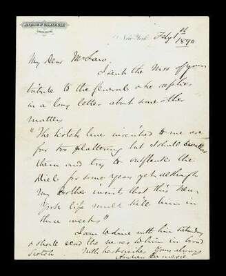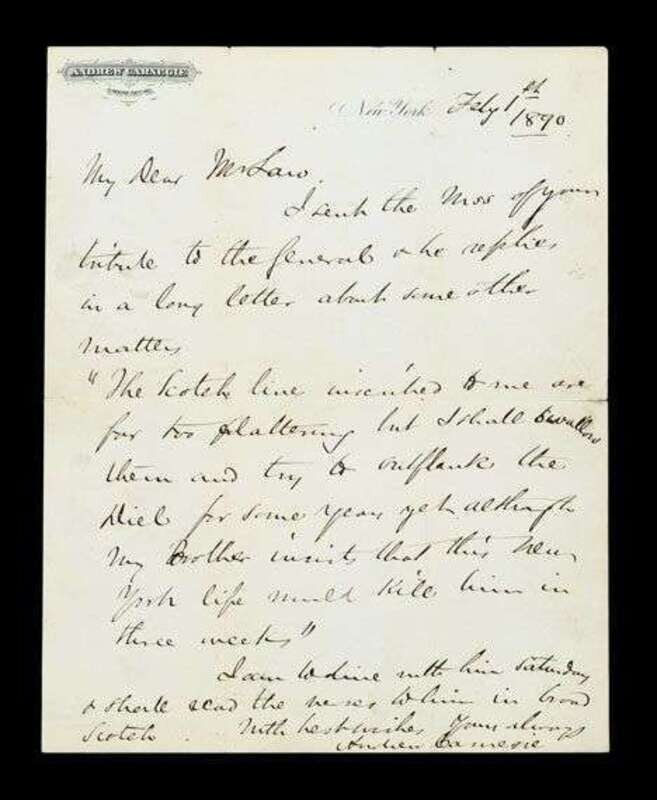 Autograph Letter Signed. Carnegie, Andrew. New York, July 1, 1870. 1 p., 4to; minor spotting, small chip at edge of horizontal fold, other light creasing along folds. To James D. Law, relating to their Scottish origins.