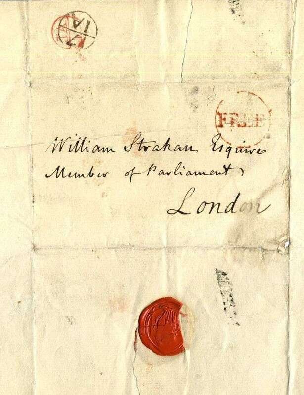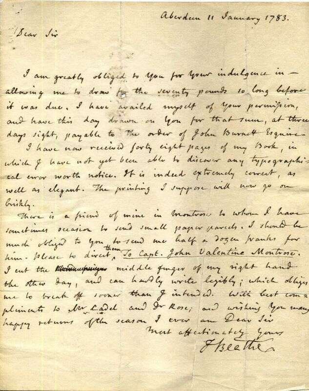 Autograph Letter Signed. Beattie, J(ames). Aberdeen, January 11, 1783. 1 p., 4to; slightly toned, a few vertical close tears - no loss of text. To William Straham, Esquire, member of Parliament, thanking him for a premature payment, reporting on the printing progress of one of his works, etc.