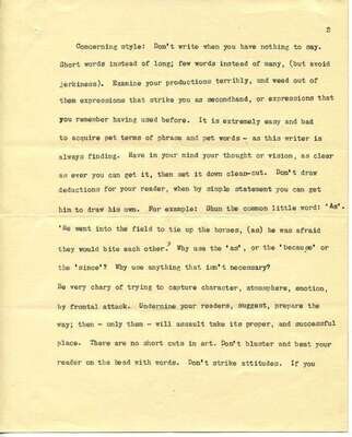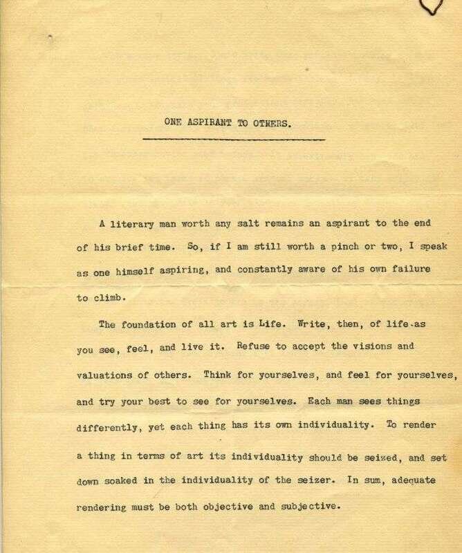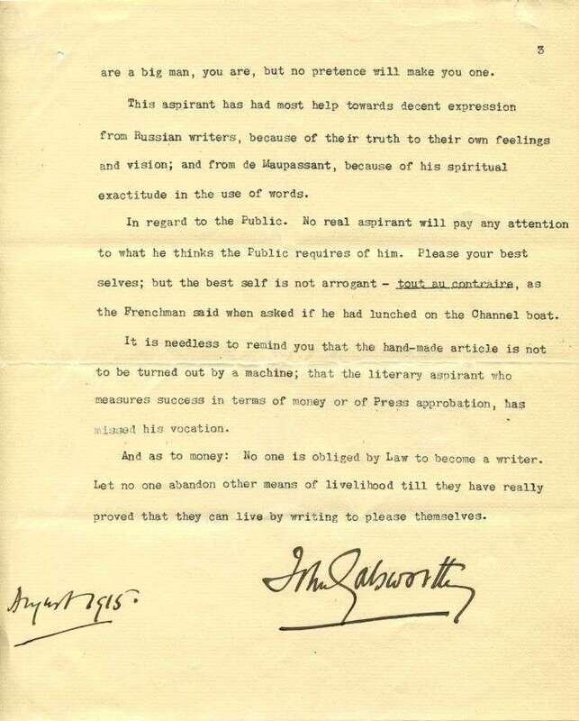 Typescript Signed. Galsworthy, John. "One Aspirant to Others." 3 pp on 3 leaves, 4to. Dated, "August 1915," & signed by John Galsworthy at foot of last leaf.