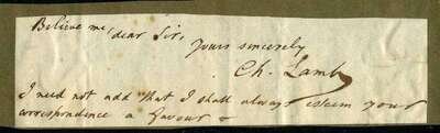 Autograph Closing of Letter Signed. Lamb, Ch(arles). Signature dark & bold.