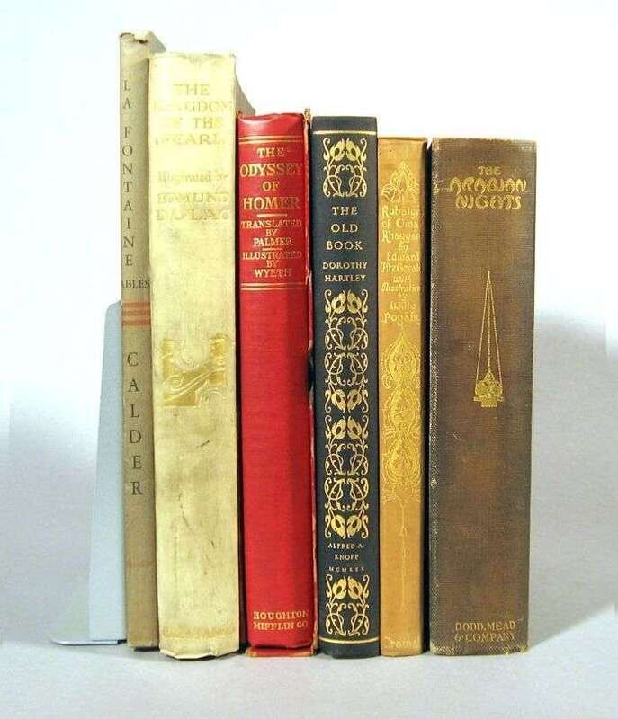 Illustrated Books: (Dulac; Edmund, illustrator.) Rosenthal, Leonard. The Kingdom of The Pearl New York: Brentano's, n.d. [ca 1925]. 4to, orig. gilt-lettered & decorated white cloth-backed silver decorated gray bds., paper cover label, t.e.g., other edges untrimmed; corners rubbed, spine slightly dust soiled. With 10 mounted color plates, lettered tissue guards. Internally clean. * (Bull, Rene, illustrator.) The Arabian Nights. New York: Dodd, Mead, 1912. 8vo, orig. gilt-lettered & decorated green-blue cloth, pictorial color cover label, t.e.g.; some edge wear, other light to moderate wear. With 20 mounted color plates (several loose), lettered tissue guards (frontis. tissue guard loose). * (Pogany, Willy, illustrator.) Rubaiyat of Omar Khayyam. New York: T. Crowell, n.d. [ca 1930]. 4to, orig. gilt-lettered & decorated brown cloth, gilt decorated paper cover label, t.e.g.; some edge wear, light to moderate dust soiling. Wth 12 mounted color plates, other illus. Book plate removed from front free endpaper recto. * Hartley, Dorothy, editor & illustrator. The Old Book: A Mediaeval Anthology. London: Knopf, 1930. #1048/1350 on Japan de Luxe. 8vo, orig. black cloth, gilt; slightly scuffed, moderate dust soiling. Color frontis., other illus. Unopened. * (Wyeth, N.C., illustrator.) Homer. The Odyssey. Cambridge: Riverside Press, 1929. 1st trade ed. Lg. 8vo, orig gilt-lettered & pictorial red cloth; light wear. With 16 color plates. Slipcase (defective). *(Calder, Alexander, illustrator.) La Fontaine, Jean de. Selected Fables. New York: G. Brazille, 1957. 4to, orig. green cloth; light wear, d/j (light edge wear).