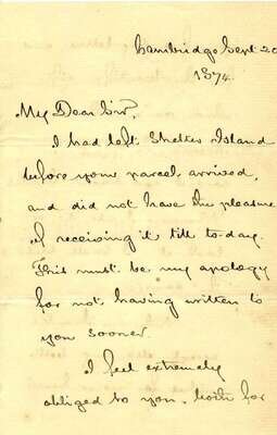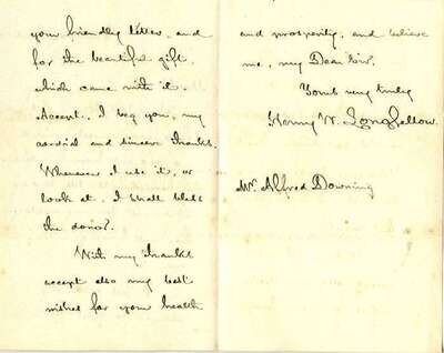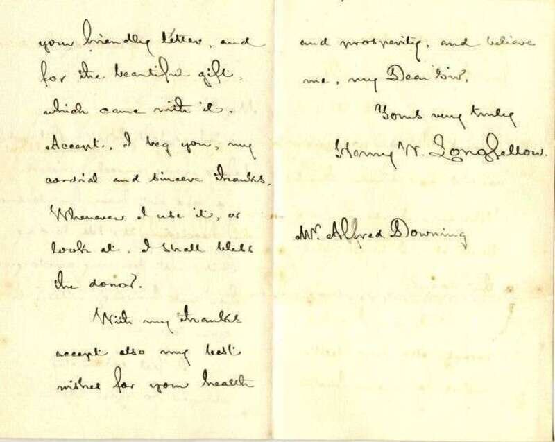 Autograph Letter Signed. Longfellow, Henry W. Cambridge, Sept. 20, 1874. 3 pp., 12mo. To Alfred Downing, thanking him for his gift & recent letter. Contents & signature dark & clear.