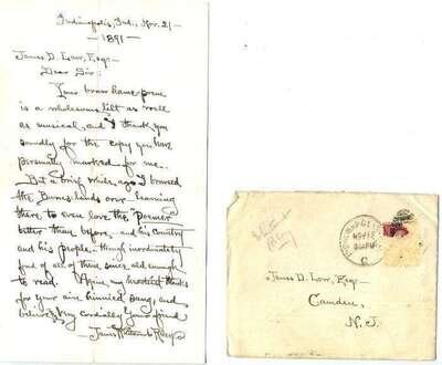 Autograph Letter Signed. Riley, James Whitcomb. Indianapolis, Nov. 21, 1891. 1 p., 8vo; light vertical crease. To James D. Law, Esq., discussing a poem of Law's composition. With hand-addressed envelope - likely in Riley's hand.