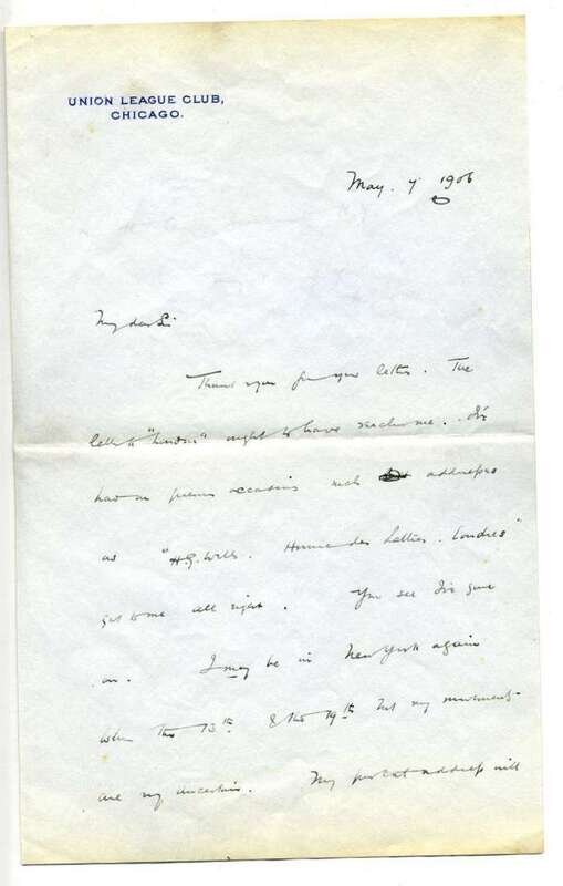 Autograph Letters Signed. Wells, H.G.: Sangate, Oct. 4, [19]03. 1 p., 12mo. * Chicago: Union League Club, May 7, 1906. 2 pp., 8vo, with integral leaf. With addressed envelope. Both to Albert M. Ballard, discussing the publication of several works.
