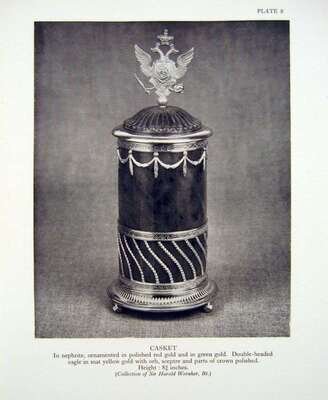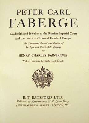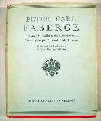 Bainbridge, Henry Charles. Peter Carl Faberge. London: B.T. Batsford, (1949). First edition. 4to, orig. red cloth, gilt-lettered spine, top edge stained deep pink; corners bumped, other light wear, d/j (some edge wear). Color plates, other illus.