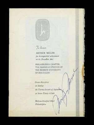 Brochure Signed. Monroe, Marilyn. Philadelphia, [ca. 1959]. 8 pp., 8vo, orig. self-wrappers. Philadelphia Chapter, The American Friends of The Hebrew University of Jerusalem, Dinner-Reception to Honor Arthur Miller. Signed in blue ink on front cover by Marilyn Monroe.