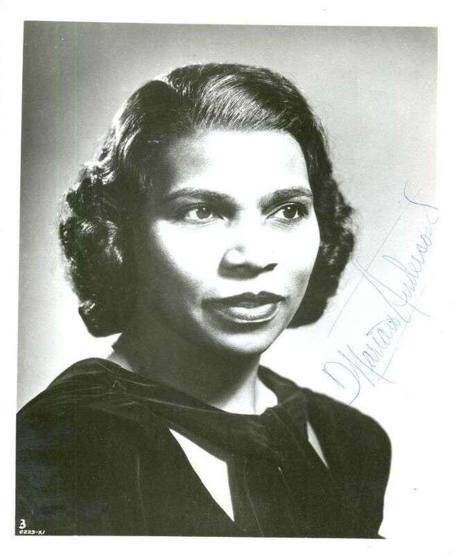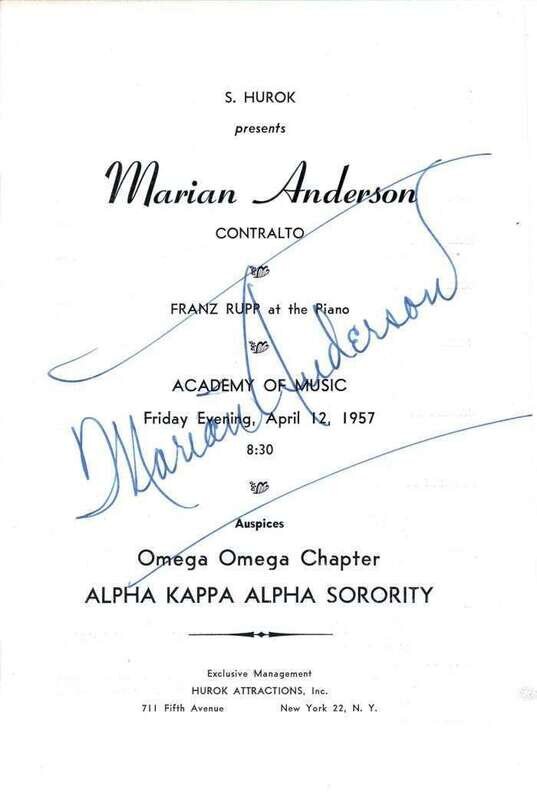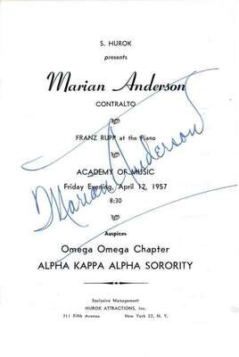 Autograph Material. Anderson, Marian: Photograph Signed. Ca. 1960. Silver print, 10 x 8 inches (254 x 203 mm). Signature clean & bold in blue ink. * Program Signed. (Philadelphia): Academy of Music, April 12, 1957. 32 pp., 8vo, orig. self-wrappers. Clean & crisp. Signed on front wrapper in blue ink by Anderson. Signature bold & clear.